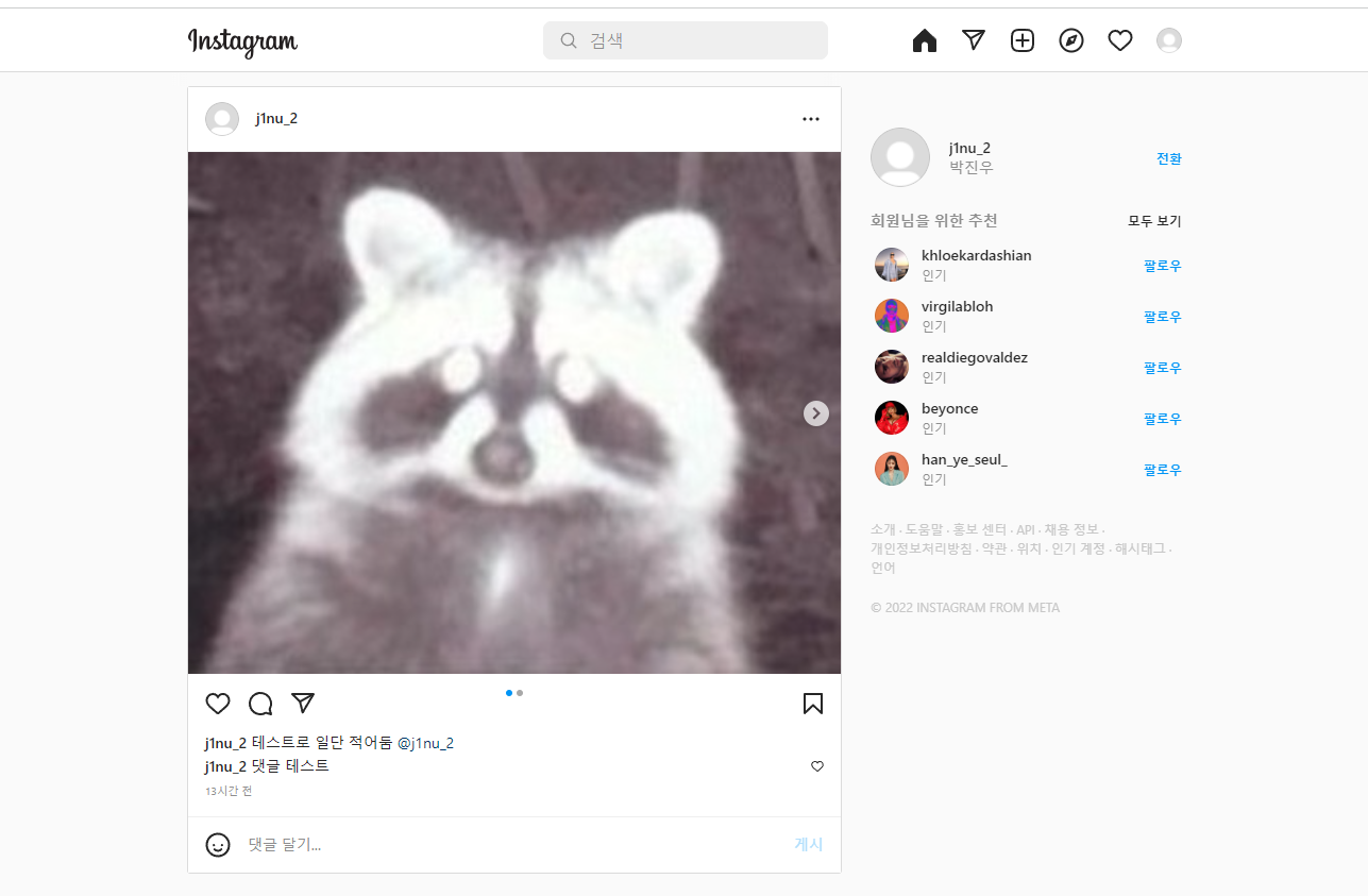 원래 SNS를 잘 안하는 나는 Instagram을 사용해보질 않아서 급하게 가입을 하여 테스트용 게시글을 하나 만들었다.