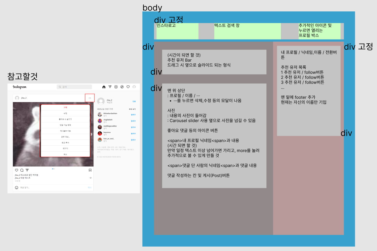 이제 다음으로 인스타 UI 클론 코딩을 위해 인스타그램 페이지를 참고하여 html파일과 css파일을 구성해주었다.
