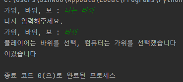 이 코드를 사용하여 계속 실행시켜봤는데, '가위, 바위, 보' 중 하나를 입력하거나 틀린 값을 입력해도 자꾸만 무한 반복이 되는 것을 볼 수 있었다.