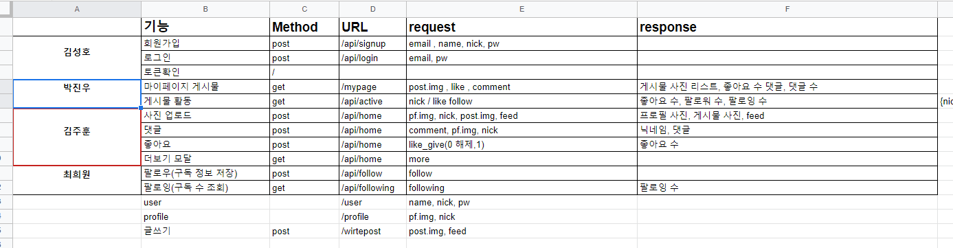 해당 부분들에 대해 어느 Method나 URL, request가 들어갈지 팀원들과 고민해보면서 진행하였다.