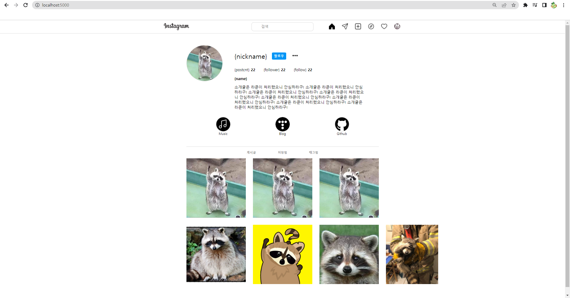 지난 시간에는 마이 페이지 UI에 대한 설정을 해주었고, 오늘은 Flask를 사용하여 MongoDB에 데이터를 가져와 활동과 하단 Feed 박스에 GET으로 불러온 데이터를 표시해주게끔 설정해주었다.