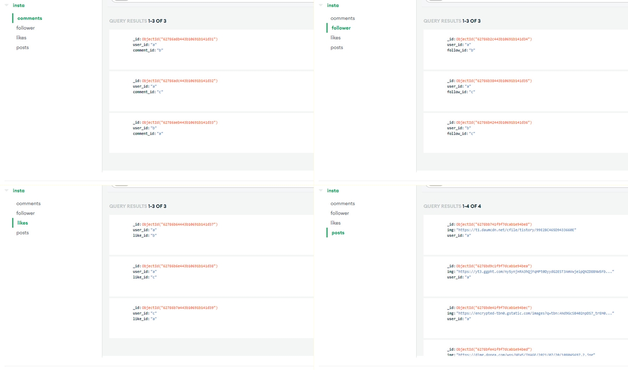 아직은 MongoDB에 데이터가 들어있지 않았기에 시작 전 테스트를 위한 테스트용 데이터들을 생성해두었다.
