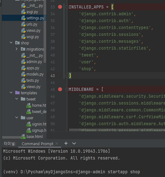 이 중에서 Many-to-Many 관계를 연습해보고자 했기 때문에, 연습을 위한 shop이라는 앱을 추가해주었다.