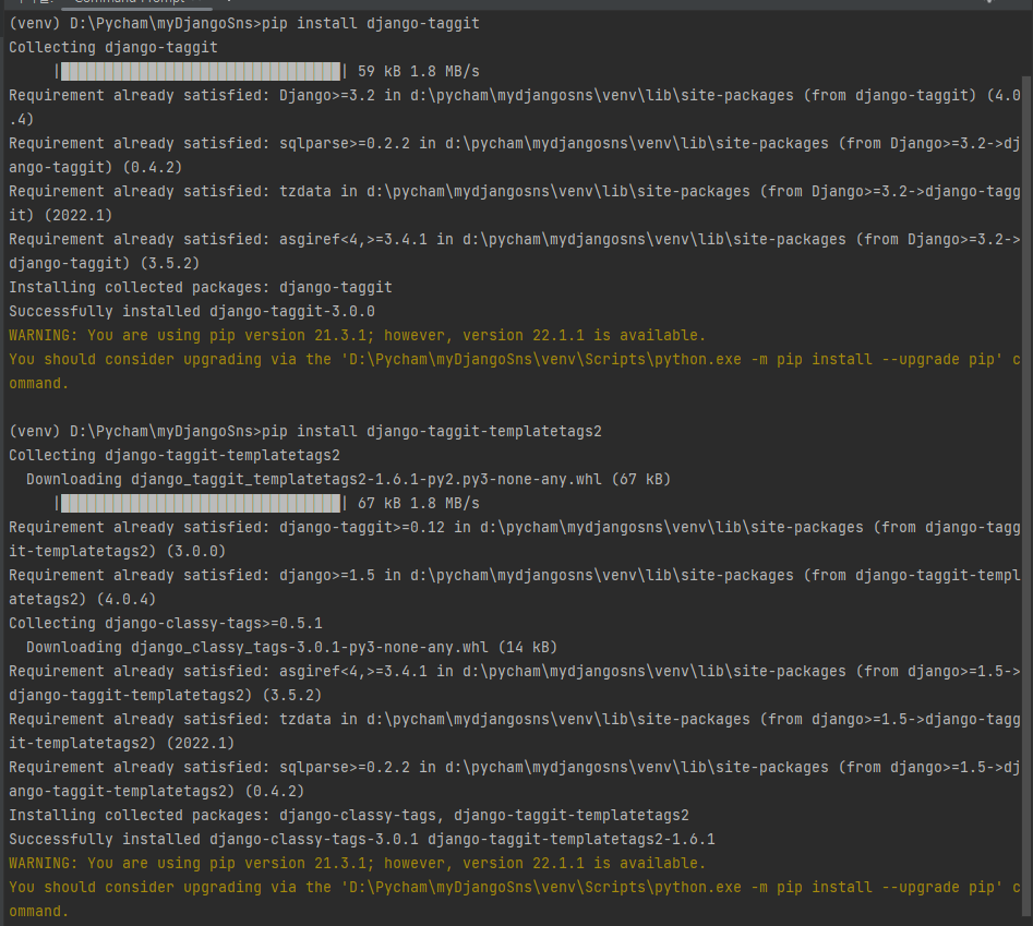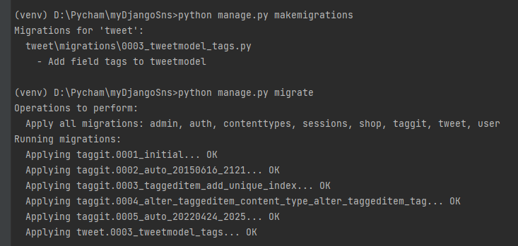 모델을 적용해준 뒤 tweet의 views.py에 해당 태그 기능들에 대한 코드를 추가하고 urls.py에 연결해주면 태그 기능들에 대한 설정이 끝나게 된다.