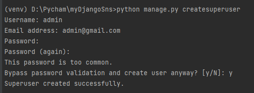 해당 데이터베이스를 삭제해주었기 때문에 지워진 모델들을 makemigrations와 migrate를 통해 수정 및 반영을 해주었고, createsuperuser를 통해 하나의 admin 계정을 생성해주었다.