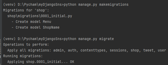해당 models.py에 대한 정보가 바뀌었으니 makemigrations와 migrate를 통해 해당 모델의 정보가 수정되었고 반영을 해주겠다는 것을 알려주었다.