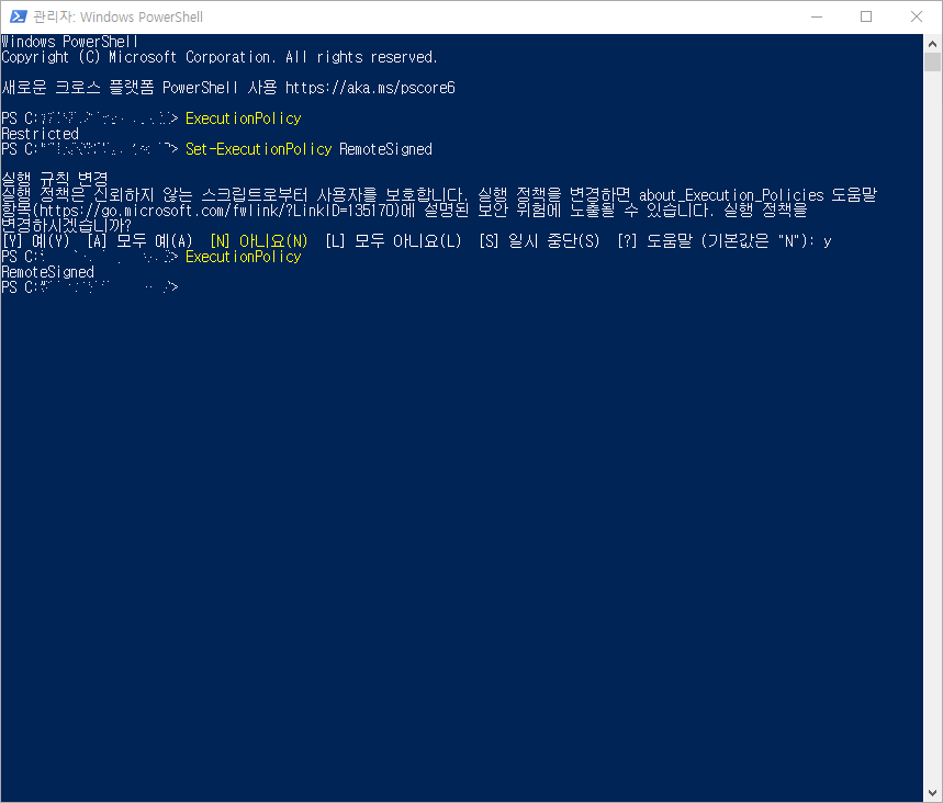 Powershell에서 확인한 결과 기본 설정인 Restricted 설정이 되어있었기 때문에 관리자 권한으로 실행해준 뒤 RemoteSigned 설정으로 변경해준 결과 정상적으로 설치가 되고 잘 되는 모습을 볼 수 있었습니다.