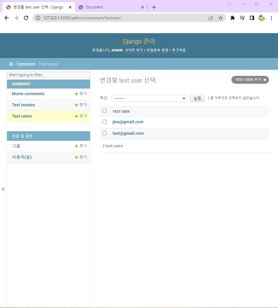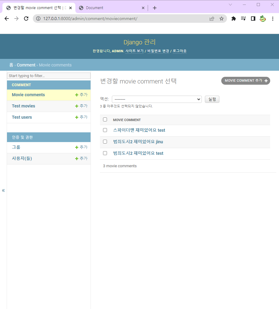 우선 createsuperuser 명령어를 통해 admin 계정을 하나 생성해주고, 테스트용 user 및 movie 모델과 댓글을 위한 모델을 생성해주었다.