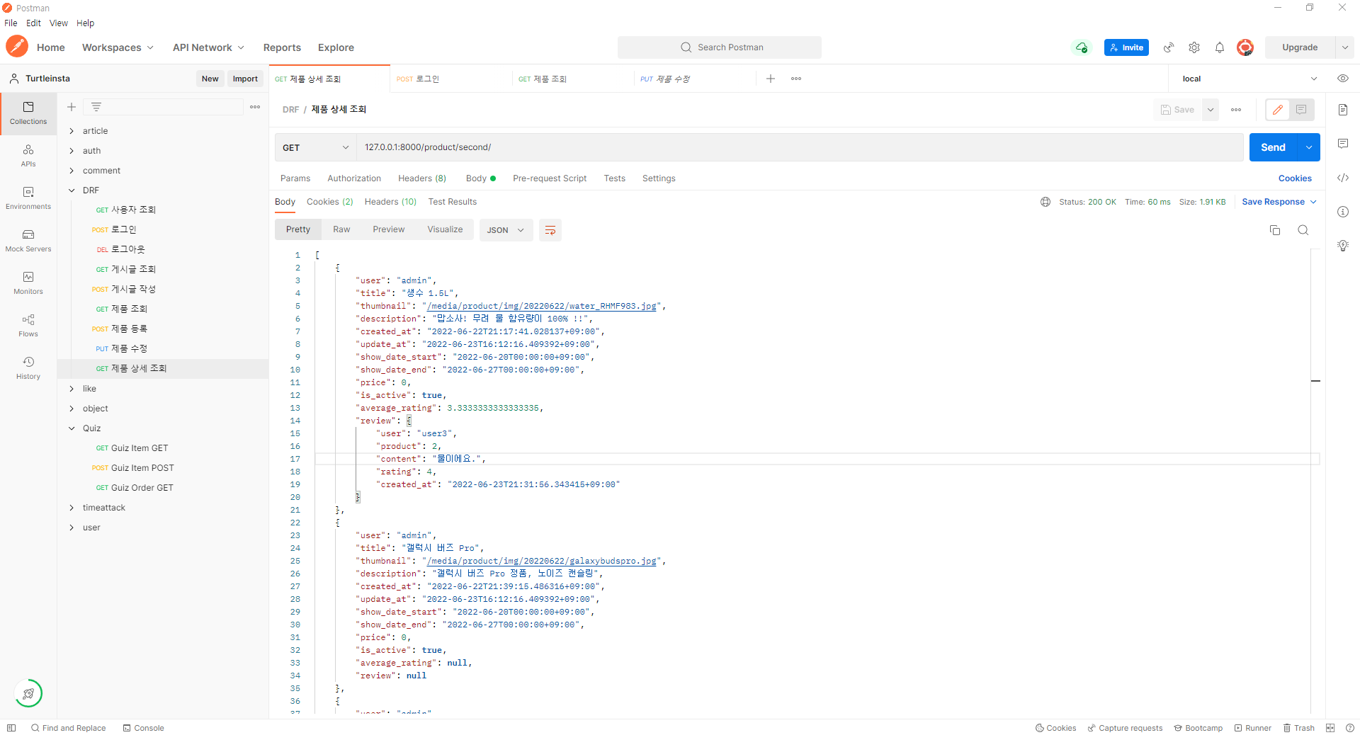 이제 제품들에 대한 review 내용을 확인할 수 있도록 ReviewSerializer를 만들어주고 해당 APIView 조회 시 제품 목록과 리뷰를 볼 수 있도록 만들어주었다.