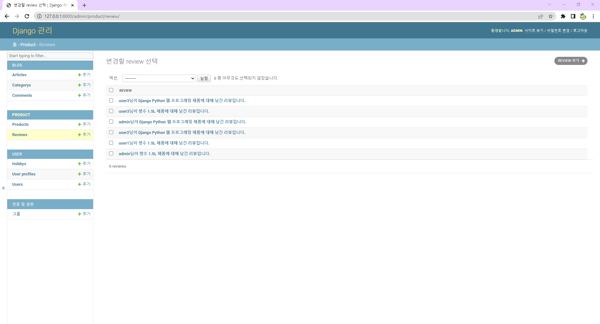 이후 새롭게 생성된 Review 모델을 관리자 페이지에서 관리할 수 있도록 product/admin.py에 해당 모델을 연결해주었다.