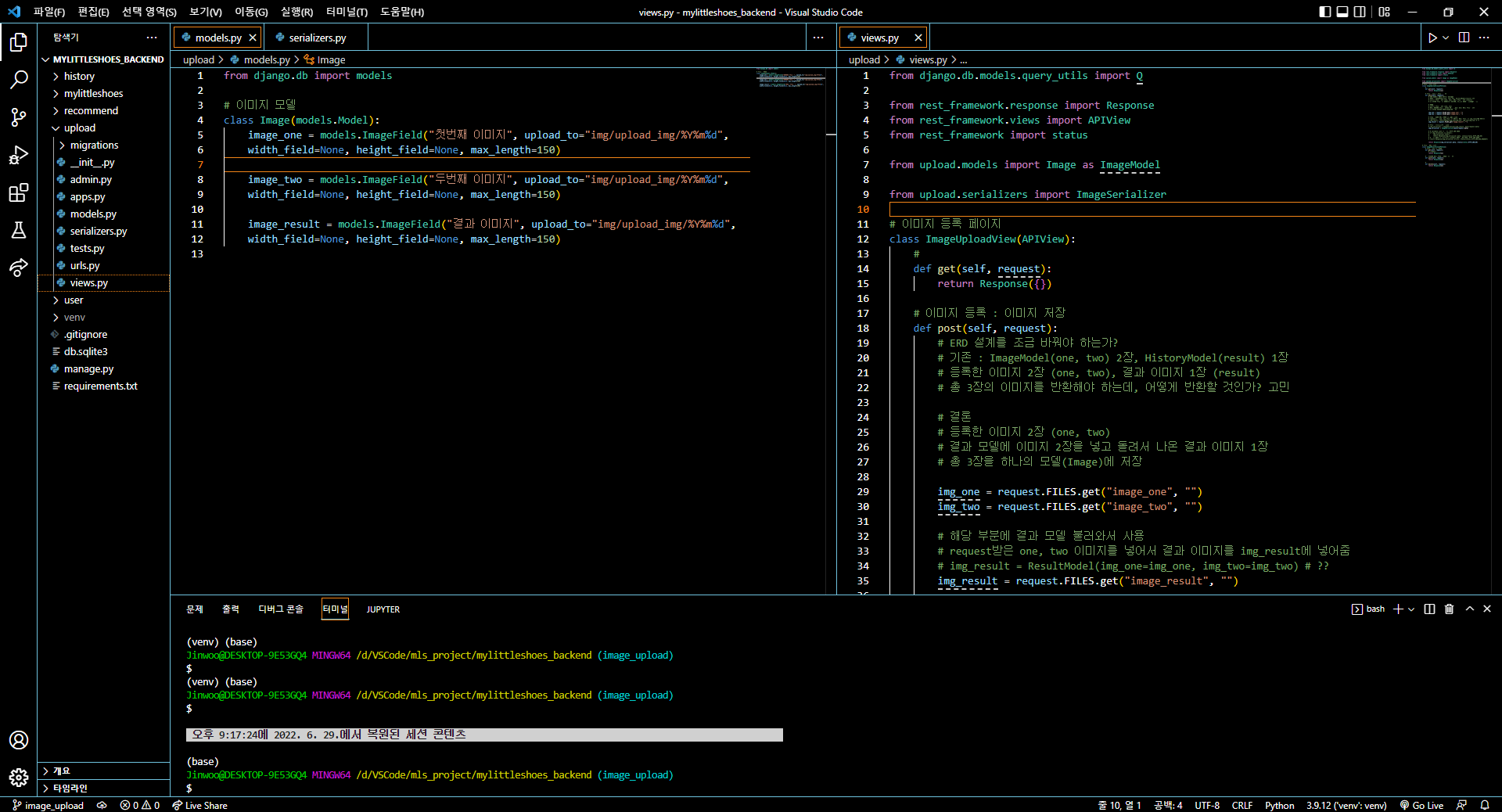 프로젝트에서 내가 맡은 역할이 이미지 업로드 및 이미지 결과를 보여주는 것이었기에 upload app에서 프로젝트 코드를 넣어주기로 하였다.