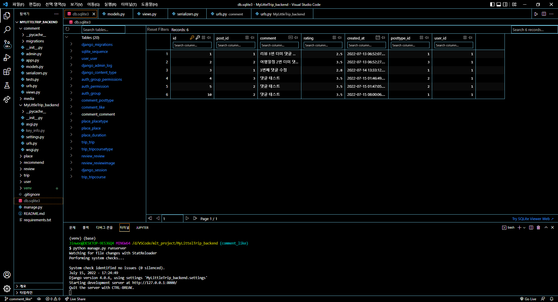 댓글 수정 및 삭제 기능을 구현해준 뒤 DB에 저장된 테스트용 데이터를 가지고 원활하게 작동되는지 확인해주었다.
